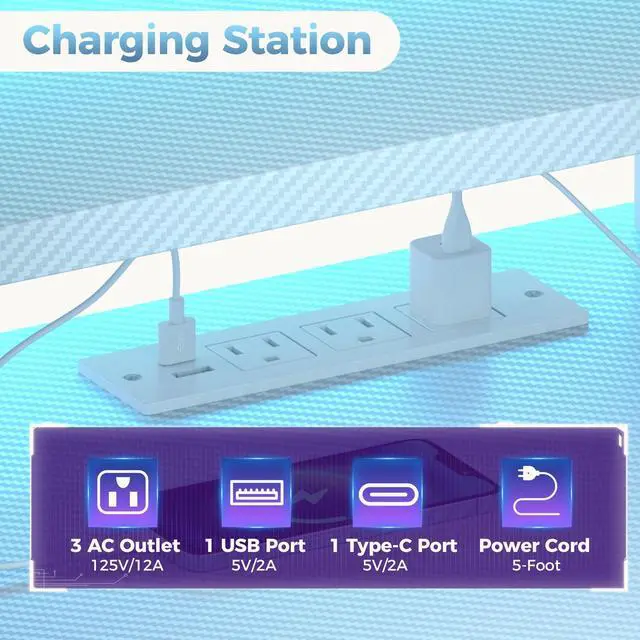 - Built-In Power & RGB Lighting Gianna computer desk features 3 AC outlets and 2 USB ports plus customizable RGB LED lighting to keep devices charged and create an immersive setup.