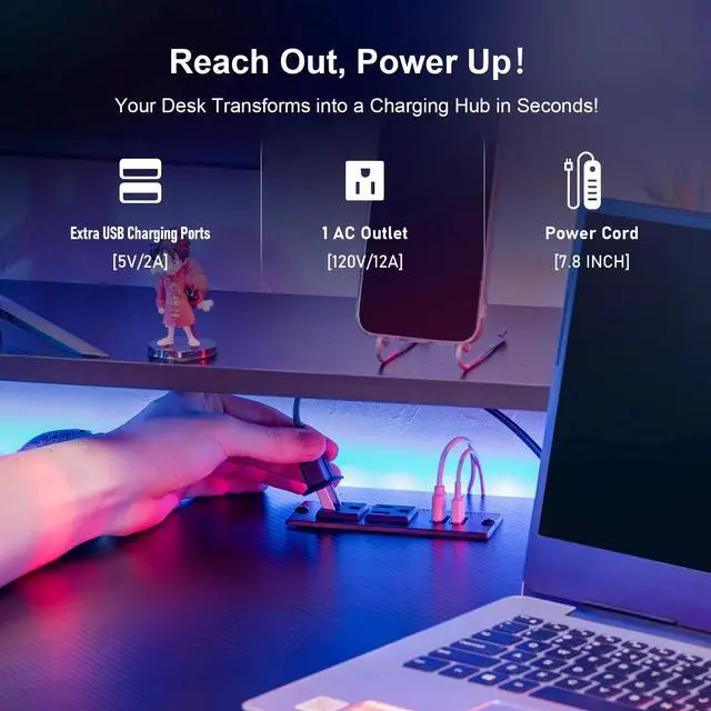 Gaming Desk with Power OutletsStay powered up and connected with this desk's cleverly designed power strip, offering two AC outlets and two USB ports. Simultaneously charge devices like iPhones and laptops without interruptions during your gaming or work sessions. Located conveniently at the desk's top right corner, you won't need to bend or reach behind your computer tower to plug in. Plus, a 4.9-foot power cord gives you flexibility in positioning your gaming desk.