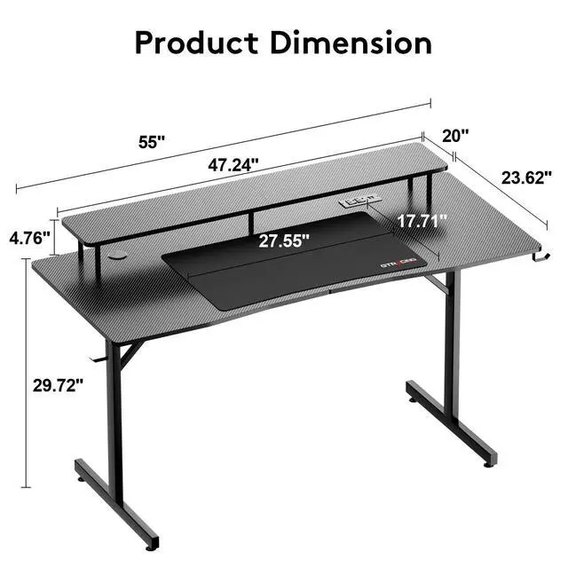 The GTPLAYER 55" Gaming Desk is built for gaming, work, or study. It includes two AC outlets and two USB ports for easy charging, plus RGB LED lights with 16 colors and 6 modes controlled by remote for an immersive vibe. A raised monitor stand helps reduce strain and frees up desk space. The carbon fiber surface is durable, water-resistant, and anti-slip. Added features include a large mouse pad, dual headphone hooks, and adjustable footpads for stability. Reinforced T-shaped legs support up to 220 lbs. With all tools included, this desk assembles in just 2030 minutes.