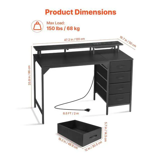 An integrated power strip allows for easy charging of phones, powering gaming equipment, or connecting additional devices. The monitor riser promotes better posture, supporting a comfortable neck position during home office tasks.