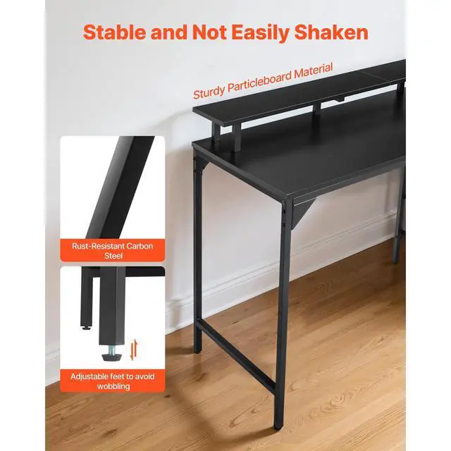 This desk features a durable particleboard surface paired with a sturdy carbon steel frame, enhanced by a reinforced base. Adjustable feet ensure stability and minimize wobbling during extended use.