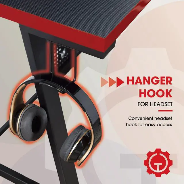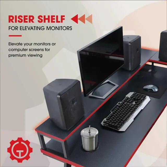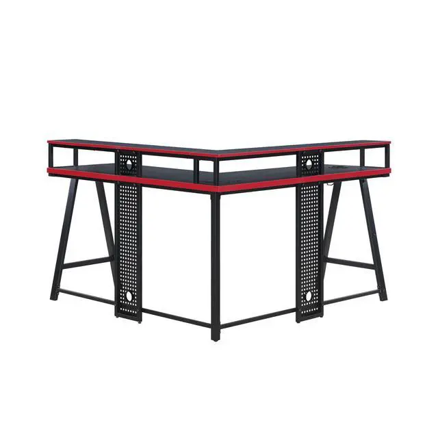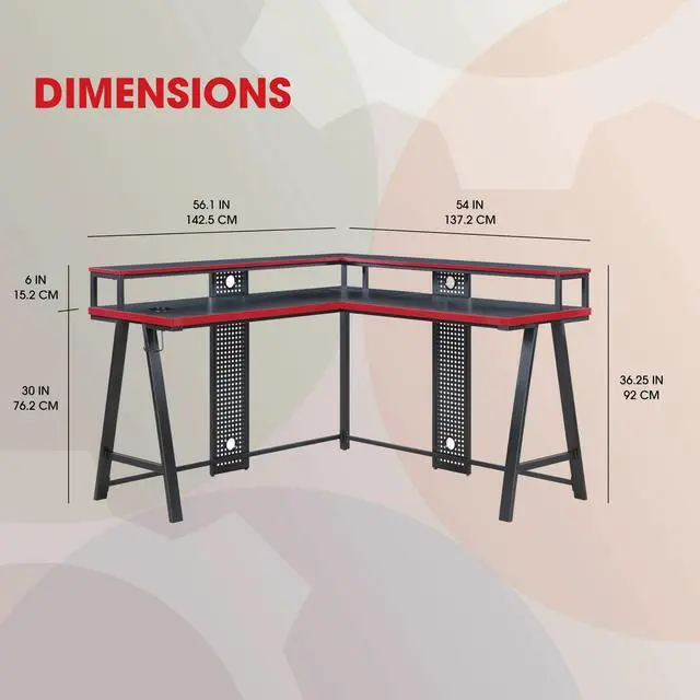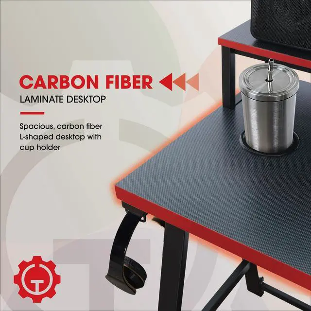 Transform your gaming setup with the Gamer Gear Gaming L-Desk. Perfect for home offices, gaming rooms, or any work and play spaces, this desk combines metal and wood construction with a sleek black finish and bold red accents. Its built-in power station features 2 sockets, 1 USB-A, and 1 USB-C charging port, ensuring your devices stay powered up. Set the perfect gaming atmosphere with remote-controlled LED lighting. Keep your essentials within arms reach with a handy cupholder and headset holder. The elevated display shelves offer the ideal monitor viewing height, while cable clips keep your setup organized. With a durable carbon fiber desktop, this techy-styled desk is designed for gamers, teens, adults, and parents looking to create the ultimate gaming space.