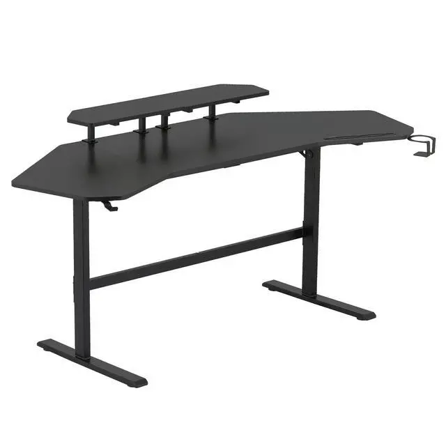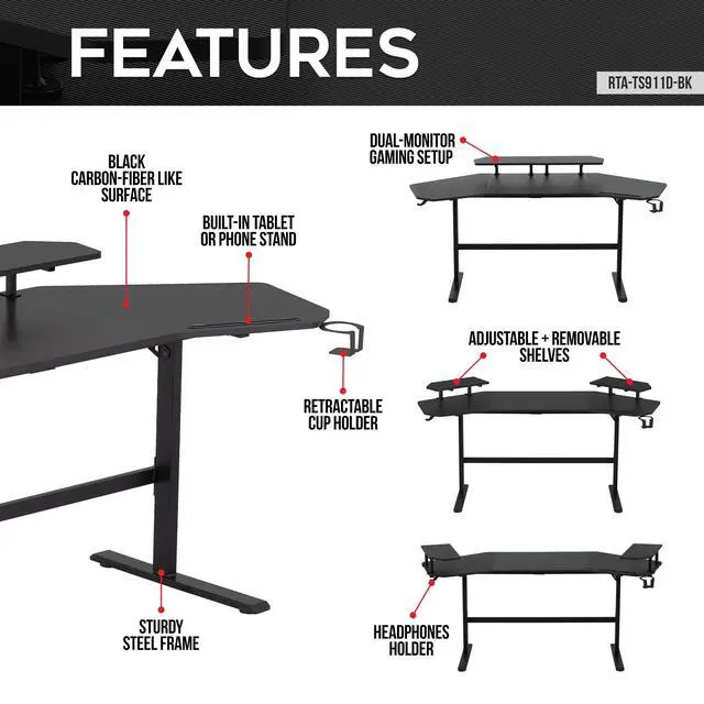 Experience unbeatable gaming sessions with the Techni Sport Defender Gaming Desk, designed for the serious gamer. Built with MDF in a stylish carbon fiber-like surface in black or white this desk offers a modern look that complements any gaming setup. Its sturdy steel frame is scratch-resistant, ensuring durability and a sleek appearance for years. With two adjustable and removable monitor shelves, it supports dual-monitor setups, enhancing your gaming experience. The desk also includes a retractable accessory holder and cup holder, and a tabletop built-in tablet or phone stand keeping your gaming essentials organized and within easy reach.