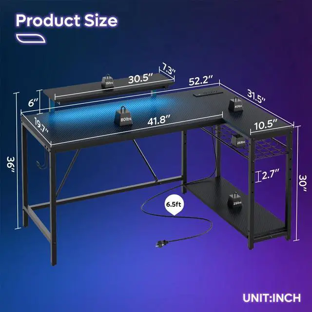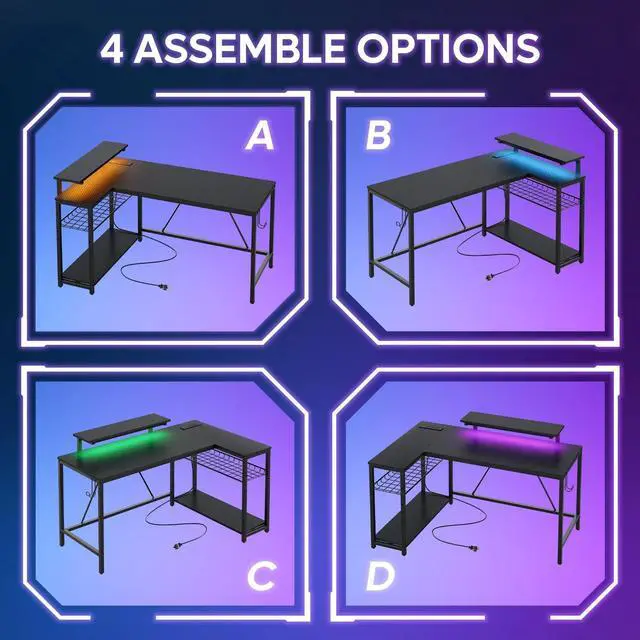 Consider this L-shaped gaming desk with LED lights for your computer desk purchase. The LED lights offer 7 main colors and 22 dynamic modes for a personalized gaming experience.