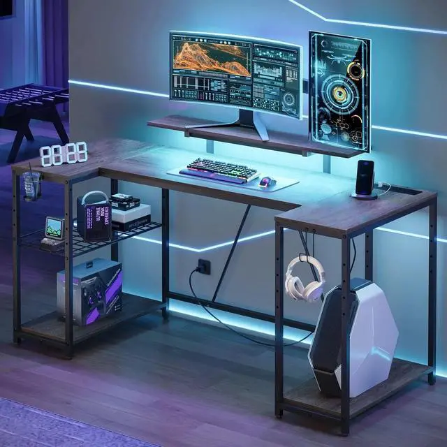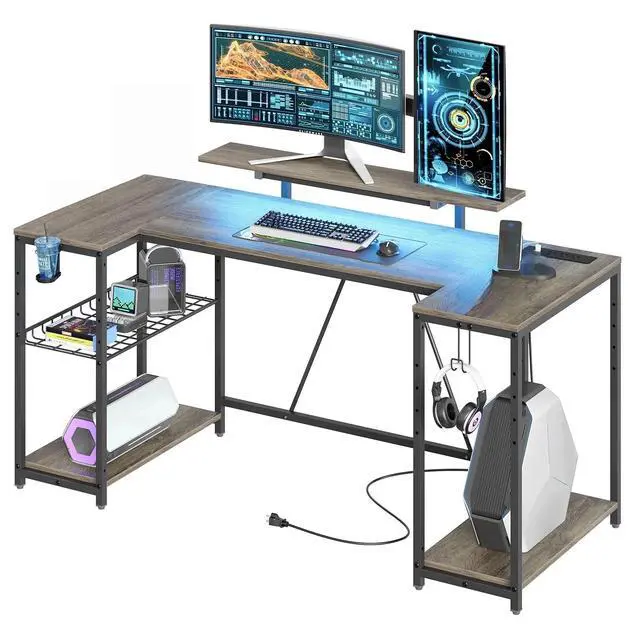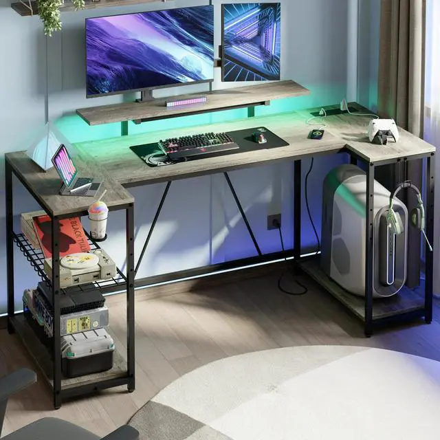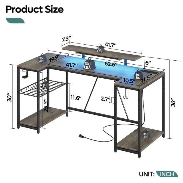 Elevate your gaming experience with our versatile and feature-packed Bestier 63-inch gaming desk. Equipped with 3 AC outlets and 2 USB ports, it can conveniently charge devices like computers, printers, and gaming gear. The computer desks LED lights, featuring 7 main colors and 22 dynamic modes, create an immersive gaming atmosphere. The 41-inch monitor stand, designed to reduce neck and eye fatigue, can accommodate two displays simultaneously. Three open shelves provide ample storage for your gaming console, files, books, and other items. The grid shelf, adjustable to three heights, can be installed on either side based on your preference. Adjustable feet and back support bars ensure stability, while the included cup holder and hooks keep your gaming environment clean and efficient.