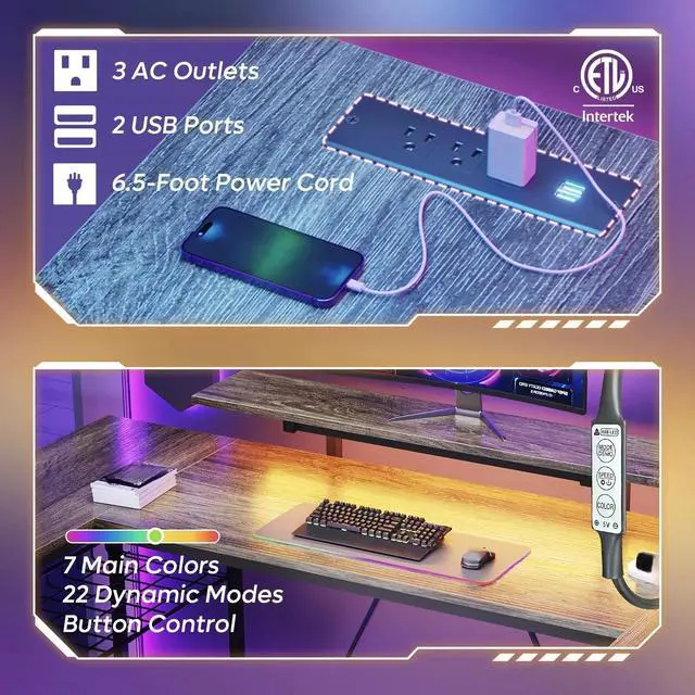 - : The gaming desk features LED lights with 7 main colors and 22 dynamic modes. Dim the lights and select your favorite color to create a fully immersive gaming environment thats uniquely yours.