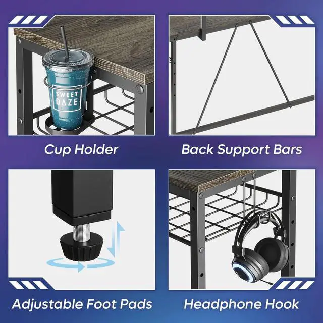 - : The gaming desk is designed with back support bars for maximum durability and stability. The adjustable feet not only protect your floor from scratches but also ensure stability on uneven surfaces. For added convenience, the desk comes with a cup holder and hooks that can be positioned on either side to suit your personal preferences.
