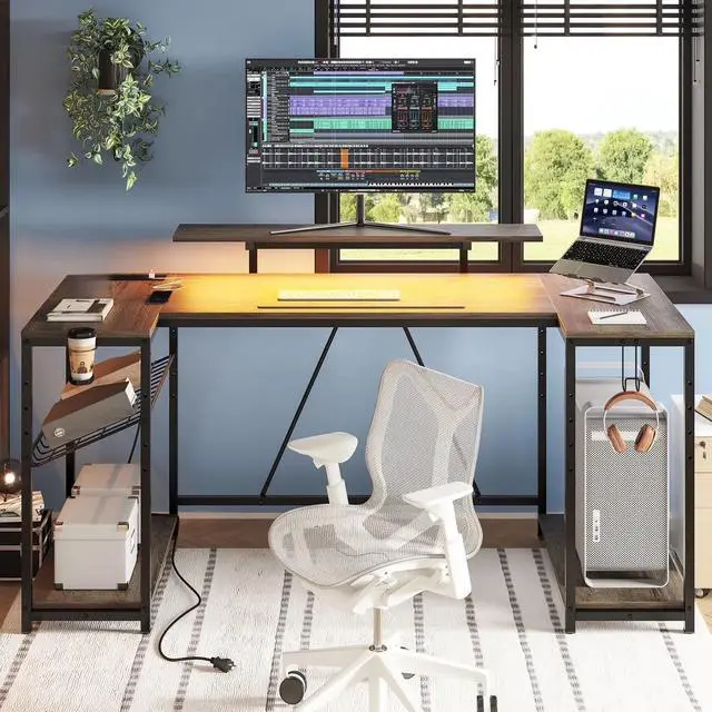 - : The corner desk is designed with three storage shelves underneath, providing optimal use of your home office space. The grid shelf offers three adjustable heights, accommodating your items and computer devices efficiently, maintaining a neat workspace while providing ample legroom.