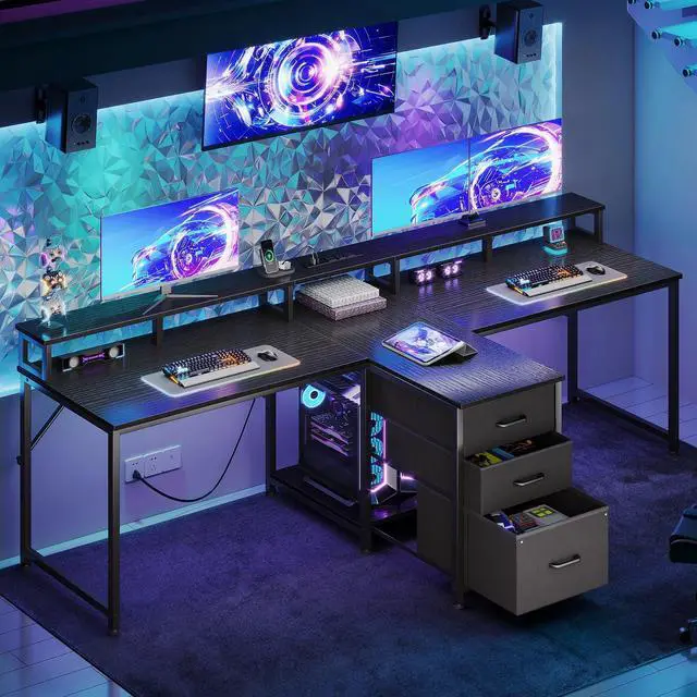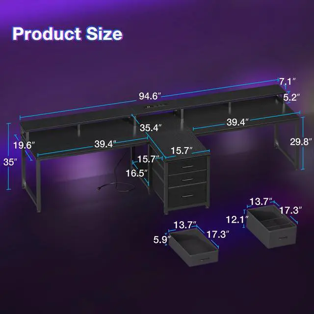 Elevate your workspace with this exceptional 94-inch long computer desk for 2 person. Featuring built-in USB ports and power outlets, it keeps your devices charged and ready to use. The included display stand provides a convenient spot for your monitor, while the 3 spacious drawers offer ample storage for your office essentials. This large and durable desk creates a aesthetically pleasing gaming environment, perfect for both individual and collaborative tasks. With its sturdy construction and spacious design, this desk is the perfect addition to your home office or gaming room.