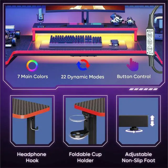 - RGB LED Lights: Step into a vibrant gaming world with our LED gamer desk. With an RGB light strip, 7 main colors, 22 dynamic modes, and adjustable speed and brightness, you can customize your desks illumination. Its the perfect gift for any gaming enthusiast.