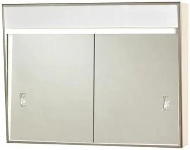 Replace your worn old medicine cabinet with this 23-3/8" Surface-Mount Framed Lighted Sliding Door Medicine Cabinet in Chrome. The cabinet has 2 fixed shelves in which to store your bathroom essentials. The mirror doors slide open- allowing you easy access to the cabinet. There is a built-in electrical outlet and light for your convenience. The sleek design and stainless steel finish complements most modern bathroom decor.Surface-mount medicine cabinet.23-3/8" W x 18-1/8 H x 5-1/2" D provides ample storage for rooms with limited space.Reversible sliding mirror doors for easy access to cabinet interior.Stainless steel for long-lasting use.2 fixed interior shelves for storing your bathroom essentials.Pre-assembled for fast and easy installation.Built-in electrical outlet for your convenience.Built-in light bar for better illumination.Adjustable hinges: No.Assembled Depth: 5.5".Assembled Height: 18.13".Assembled Width: 23.38".Assembly Required: No.Cabinet material: Steel.Color Family: Beige/bisque.Concealed hinges: No.Decorative door pull/handle: No.Fog Free: No.Frame Material: Metal.Frame finish family: Light.Integrated electrical outlet: Yes.Mirror on back of door: No.Mirrored back cabinet wall: No.Number of Shelves: 2.Optional mirrored light fixture: No.Recessed: No.Shelf width: 23".Width: 29" and under.