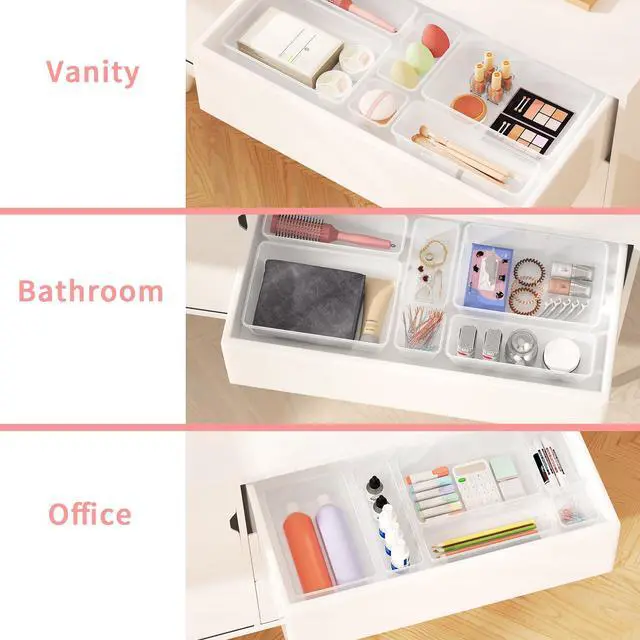 Keep Drawer Tidy: lt helps to neatly classify and store different messy items in the drawer. Flexible drawer organizer for makeup, brush, skincare and other junk at home. It's good helper for bathroom, bedroom nightstand, kitchen, desk and other spaces