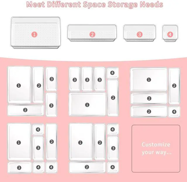 Multi-size Combination: There are 25 pcs drawer organizer trays in 4 sizes, which are suitable for most drawers. It can also be DIY trays to arrange to meet different storage needs. Includes: 9 x 6 x 2 inches (3pcs), 9 x 3 x 2 inches (6pcs), 6 x 3 x 2 inches (8pcs), 3 x 3 x 2 inches (8pcs)