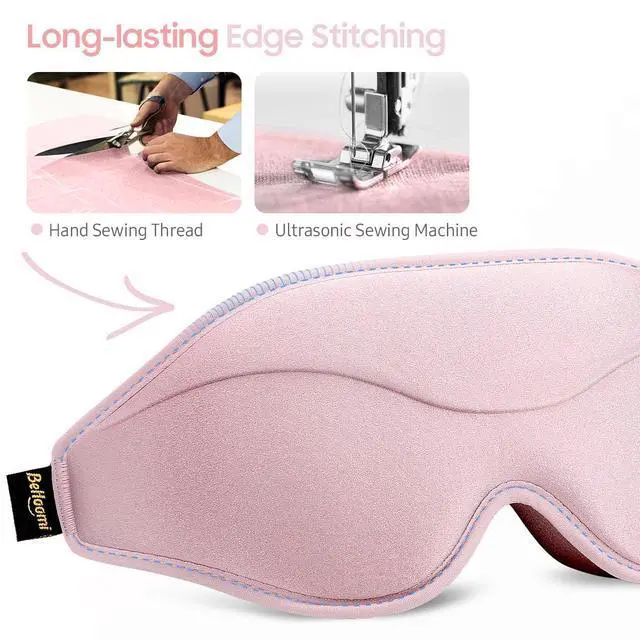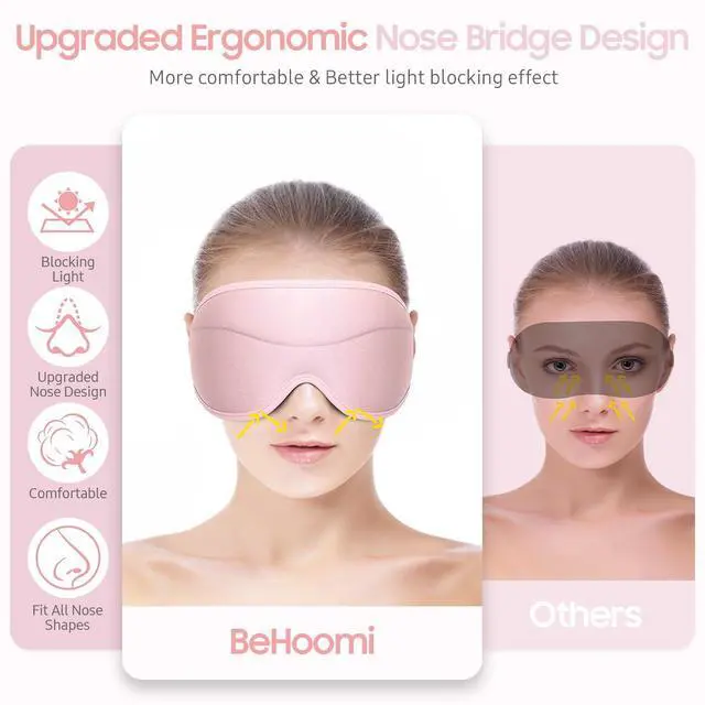 BeHoomi Sleep Mask, Premium Eye Mask for Sleeping, 3D Ergonomic Designed Sleeping Mask, Upgraded Light Blocking & Blindfold Sleep Masks for Women, Men | Pink Color Customers' words, If you are a side slipper, the sides have extra padding for comfort. The pink color is very classy and elegant. These are perfect for eyelash extensions!! I can even blink my eyes inside and it blocks out all the light. It's the first one I've tried that absolutely blocks all light and is comfortable as well. On a non-functional note, I love the color. I'm not sure how much fashion matters when it comes to eye masks, but it was the reason I got this specific one so if that matters to you this is a good choice. Silky smooth memory foam sleeping mask This is the best mask for long-haul flights! This mask had absolutely no odor; I did not have to wash it or air it out. It was a pleasant surprise. This eye mask has padding all around the eyes and is extremely comfortable to wear for long periods of time. Ive used many sleep masks (including much more expensive ones), and its quite rare to find one that blocks out every bit of light the way this one does. The grey color is beautiful, it gives a luxury look, not just a sleep mask. Completely blacks out all light. No marks left on face. No loss in blood circulation. No new acne. I sleep with this thing on my face like a teddy in my arms. Enjoy Keeps 100% of all the light out only product like this I've tried that does what it says