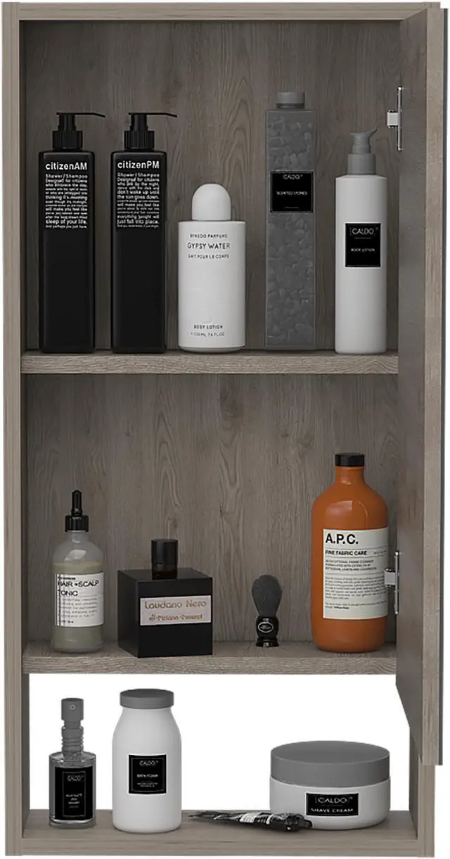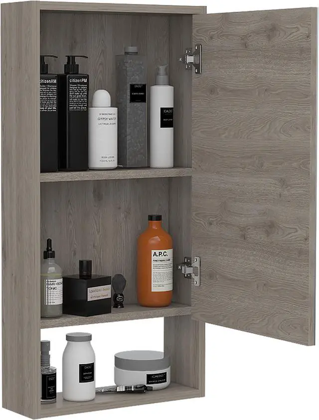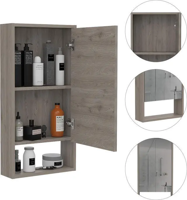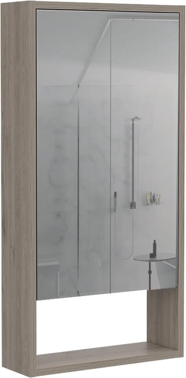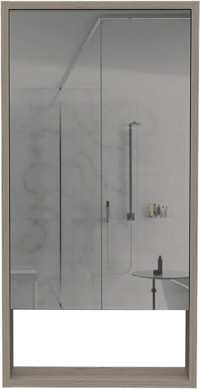 The Modesto mirrored medicine cabinet is a very functional and large mirror medicine cabinet with great features that will stand out: A mirror cabinet door 27 inches high and 16.4 inches wide will give you the elegant, modern look to your bathroom you so much desire. Inside the cabinet, you will find two interior shelves with plenty of room to keep your medicines, lotions, shampoos, or any other product you regularly use. At the bottom of this cabinet, it has an open shelf to place your items elevated from the sink, keeping your bathroom organized and well maintained. It is manufactured with treated engineered wood to protect it from the regular exposure to water and humidity found in a bathroom. Product dimensions are 17.9" W x 5.6" D x 35.4" H. Light Gray Finish