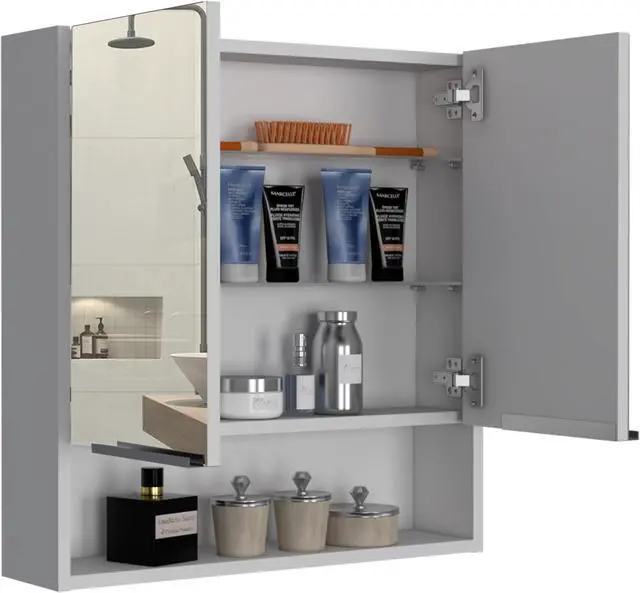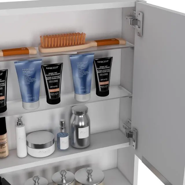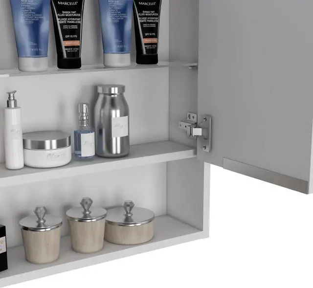 The Ozark bathroom medicine cabinet is an elegant, modern, functional, and utterly simple mirror medicine cabinet. Featuring a two-door mirror cabinet, inside, you will find three interior shelves that will allow you to store your medicines, lotions, shampoos, or any other product you regularly use. At the bottom of this cabinet, an open shelf provides a place to have your items elevated from the sink, keeping your bathroom organized and well maintained. It is manufactured with treated engineered wood to protect it from the regular exposure to water and humidity found in a bathroom.
