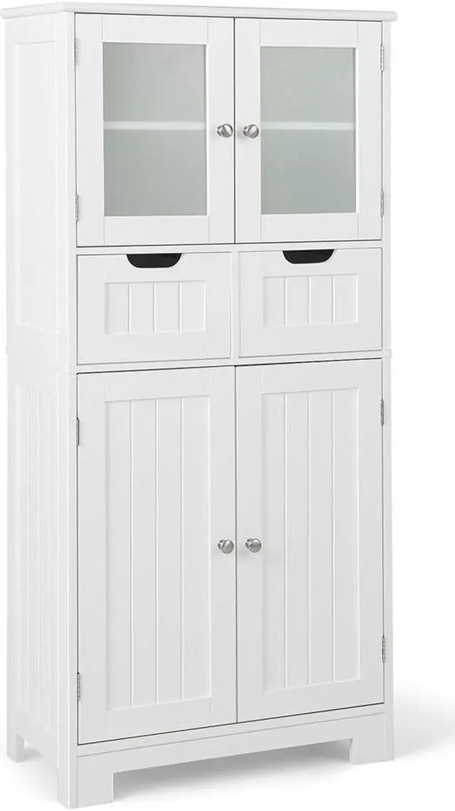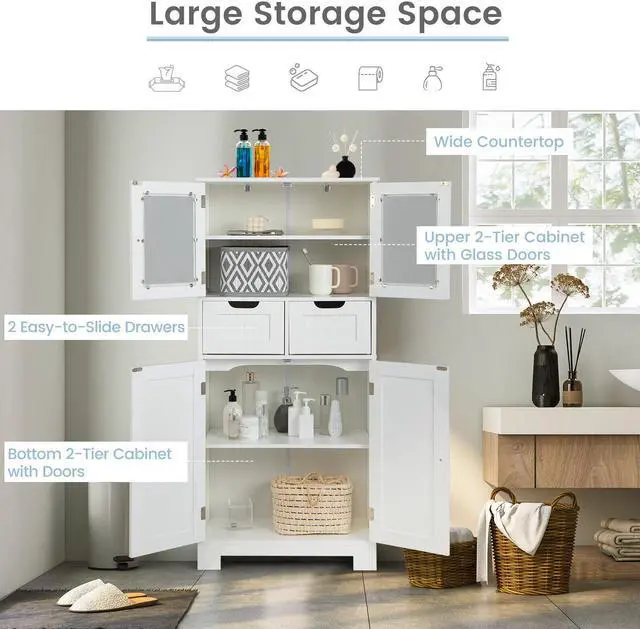 Selected and Durable Material: Crafted from high quality P2 MDF with painted surface, this bathroom storage cabinet ensures long-lasting use, strong stability and is not easy to shake. In addition, the upper frosted glass doors are made of tempered glass, which has high hardness and good shatter resistance.