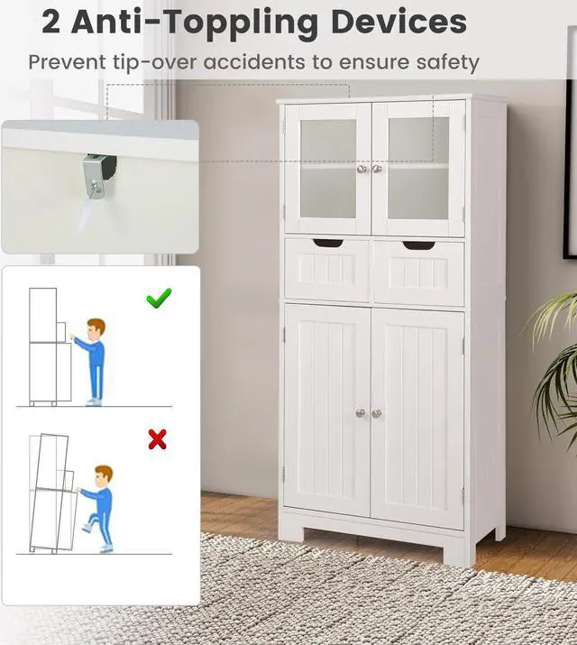 Safe Use and Well-made Details: The back of the floor storage cabinet is equipped with 2 anti-toppling devices, which prevent tip-over accidents to ensure safety. Plus, the smooth and exquisite round handles and functional magnetic catches make it convenient to open and close the cabinet doors.