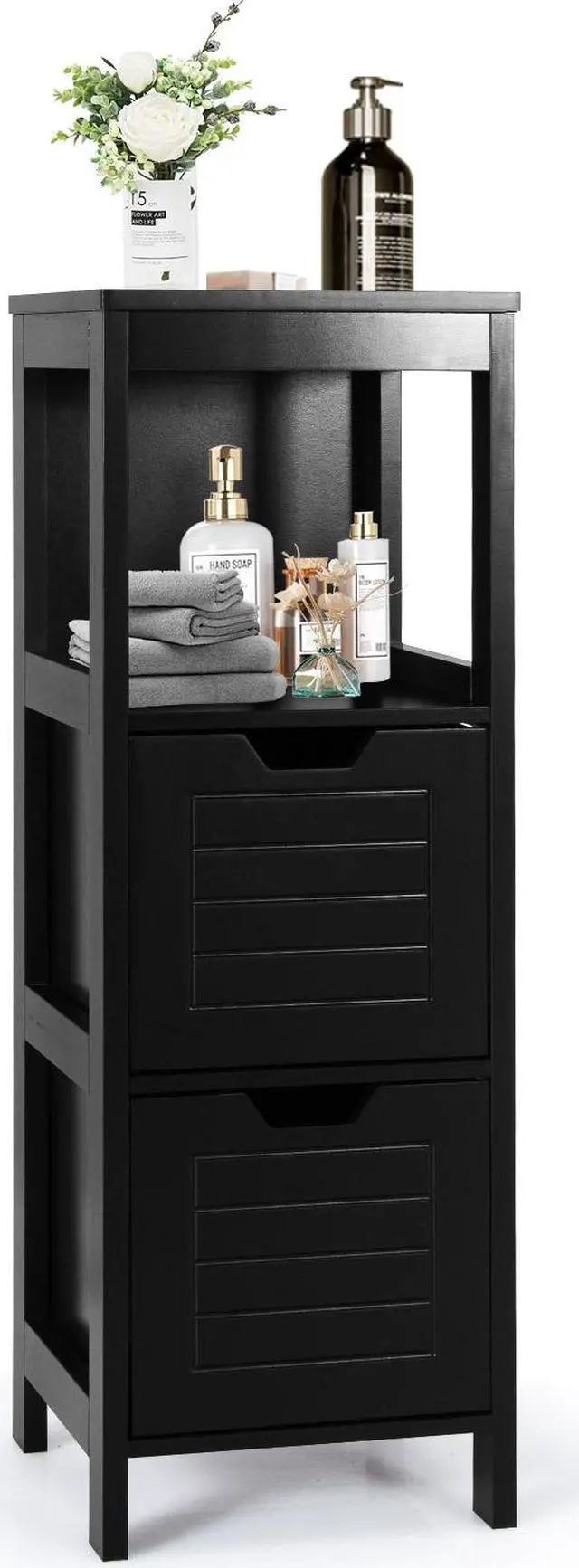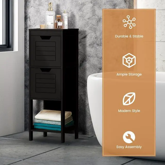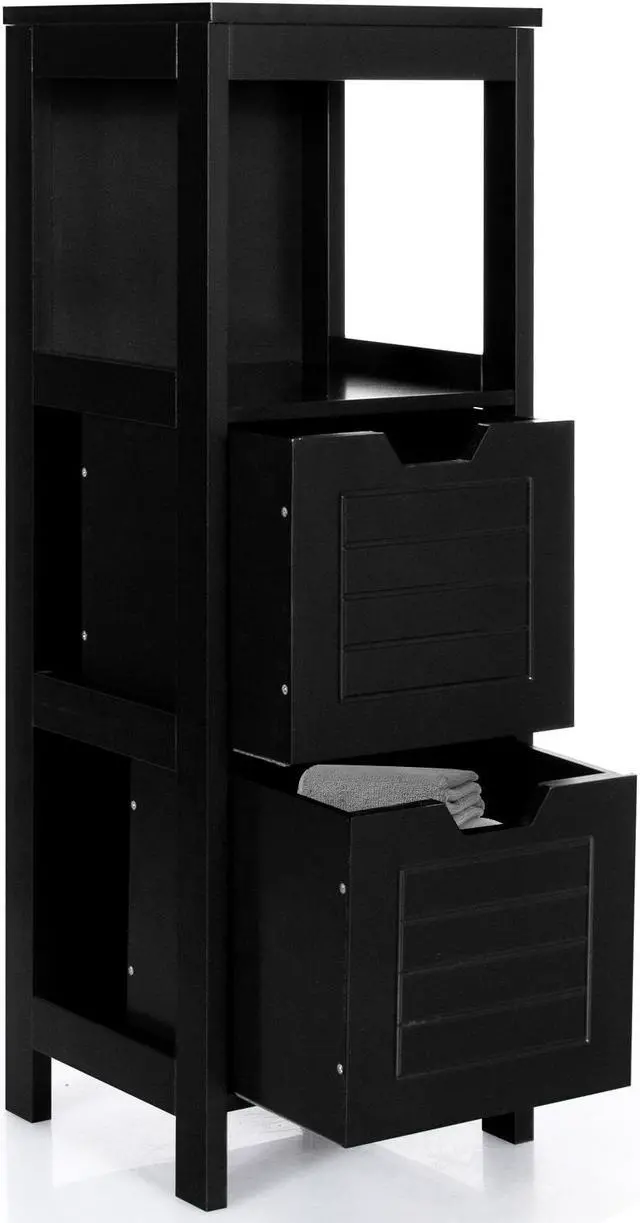 You can put it in the bathroom, living room, bedroom, office and lounge. It has a total of three floors, and you can hide privacy items in two drawers. Drawer handles are hollowed out, which can ensure the safety of your kids. It is made of MDF board, which is wear-resistant, strong in load-bearing capacity and durable. The stable support legs design makes the structure stronger. The smooth surface is easy to clean and maintain. And you can assemble it in a short time.