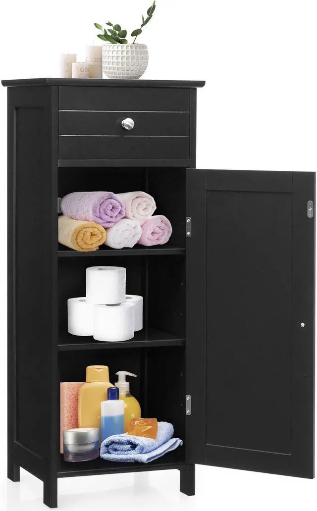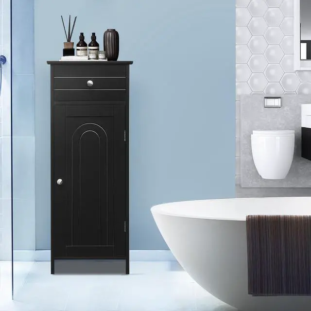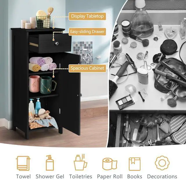 Large Storage Space: This bathroom cabinet occupies a small space and effectively uses the vertical space. The top can be used to place photo frames and some decorations. The drawer and single-door cabinet provide ample storage for your toiletries, cosmetics, books, etc., while preventing dust from entering.