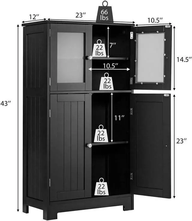 Hassle-free Assembly and Cleanup: This floor storage cabinet with 4 doors comes with detailed instructions and all the necessary parts for you to assemble it easily while saving your time and energy. What's more, the painted surface of the cabinet is smooth, anti-scratch, and easy to clean with a damp cloth. Overall dimension: 23" x 12" x 43" (L x W x H).