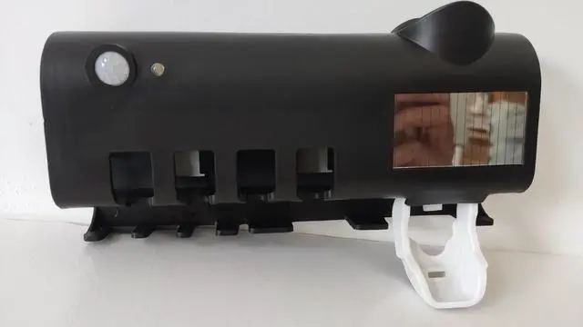 SOEWIOU black wall-mounted toothbrush organizer features a punch-free wall hanging design, no drilling and no wall damage. This all-in-one unit combines smart induction automatic toothpaste extrusion, high-efficiency disinfection and large-capacity storage. The sleek black minimalist style fits most bathroom decoration styles. Contactless operation is clean and hygienic, with independent slots for storing multiple toothbrushes. Compact and waterproof, it keeps your bathroom tidy, dry and sanitary for daily family oral care.
