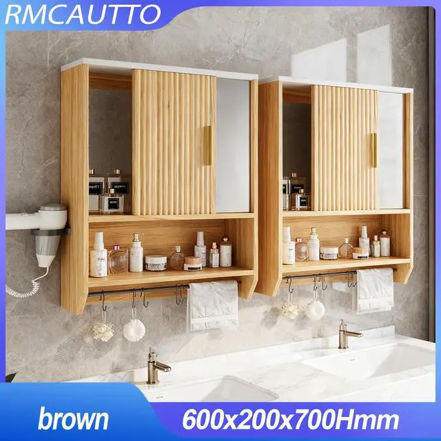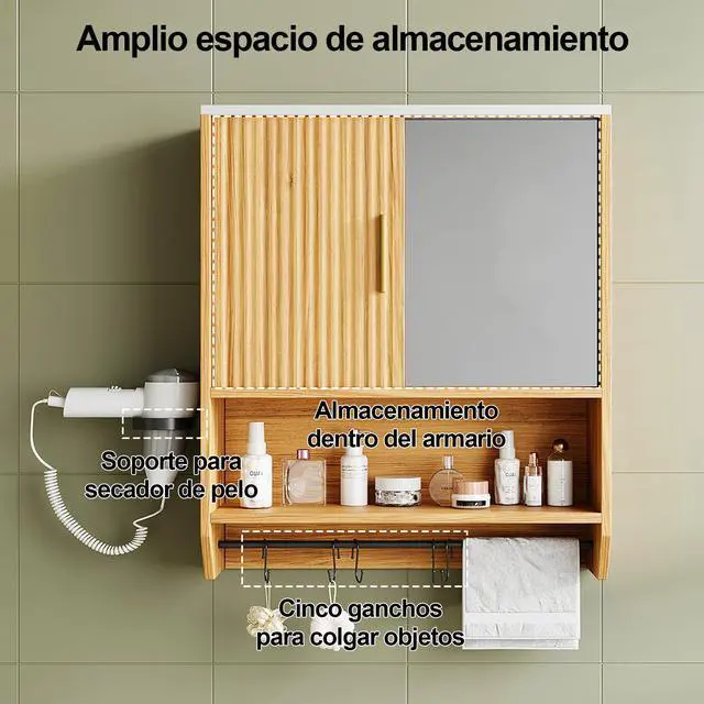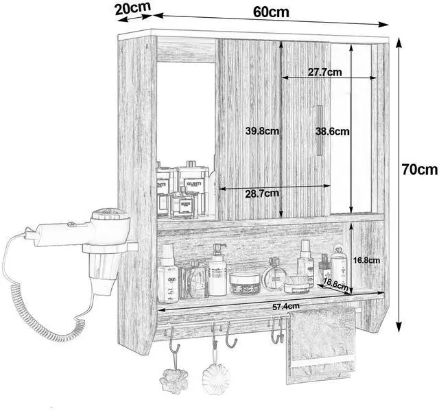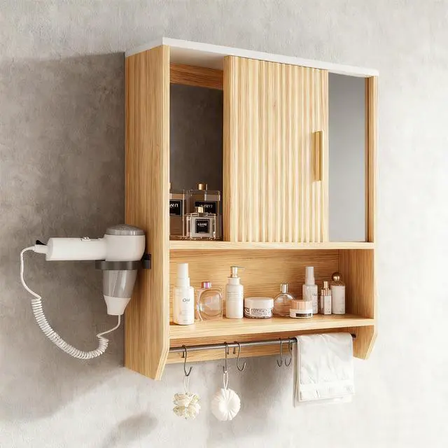 Practical design: the wall cabinet adopts a closed mirror cabinet, an wavy-pattern cabinet and open bottom design, and is equipped with a removable towel rack, a hairdryer rack, and 5 additional hooks to meet your needs for storing different items.
