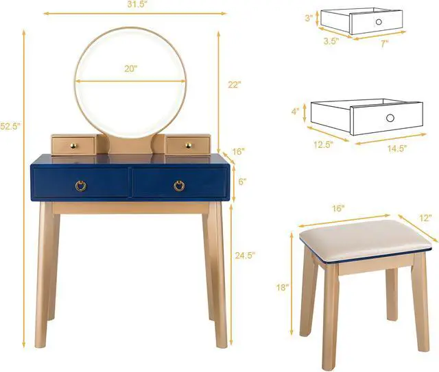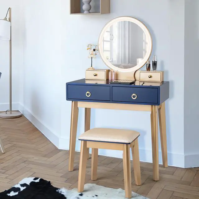 With simple and modern style, this vanity table shows an unparalleled temperament and will be a best addition to you bed room. Designed with touch screen dimming mirror, this dresser enables you to do makeup even the light is bad. There are three lighting modes of nature, warm and cold for you to choose. This soft light will perfectly add charm to your unit and you will never feel dazzling. As it is made of P2 grade material, there will be less pungent smell that makes you sick. Equipped with four drawers of different sizes and combined with the desktop of large size, the table provides spacious space for you to store cosmetics and other necessities. All of details make it a perfect makeup desk. Do not hesitate to purchase.