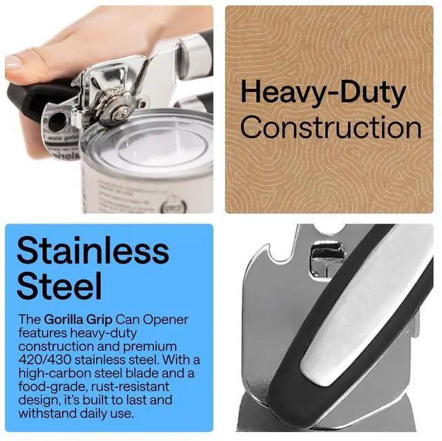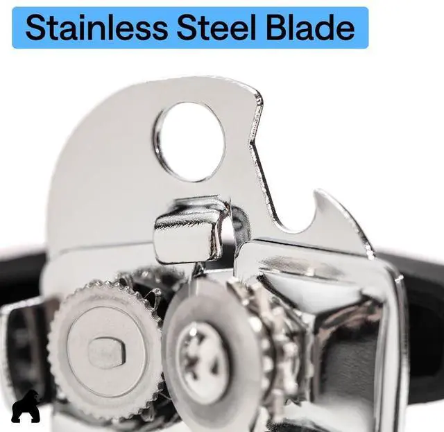This manual can opener is constructed with rust-resistant stainless steel and is long-lasting. The heavy-duty design ensures smooth, reliable performance for years. For best results, hand wash and dry completely after each use.
