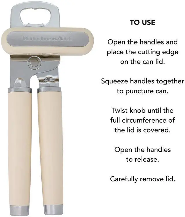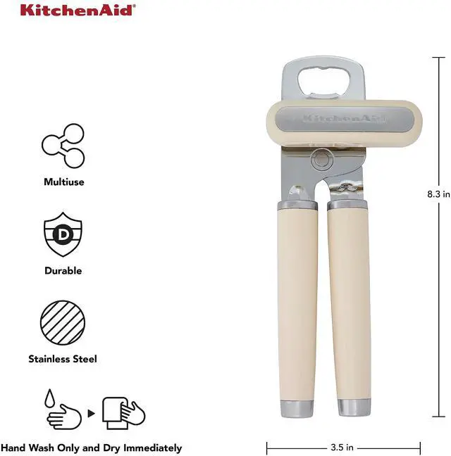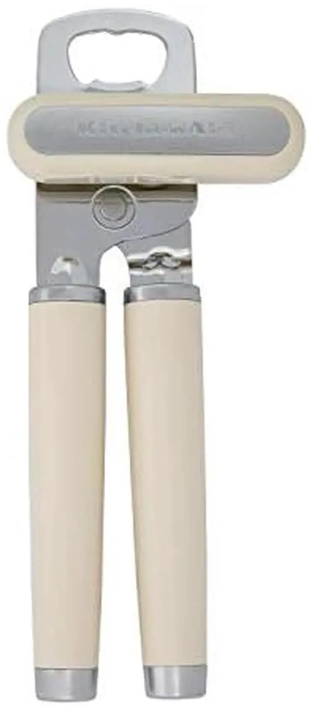 Classic Multifunction Can Opener and Bottle Opener Easy to Use, Razor Sharp Stainless Steel Cutting Wheel, Soft Ergonomic Handles, Almond Cream