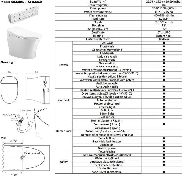 [Safety]: Anti counter current (with check valve), Water purify(filter), Antiseize glaze toilet bowl, 6 level safety protection. Splash-proof in full range. Can be flushed by foot induction (Cannot automatically open and close the toilet lid).