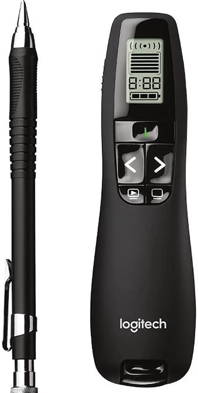 With a 2.4 GHz wireless range of up to 100 feet, presenters can move throughout the crowd with ease. Don't worry about the remote dying with a battery life of up 1,050 hours when used as a presenter or 20 hours when using the laser pointer Logitech R800 function. The LCD screen displays the time, battery life and wireless reception distance with the option to set vibrating alerts to help presenters focus on their speech or talk.