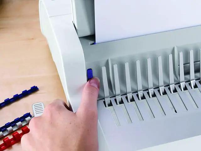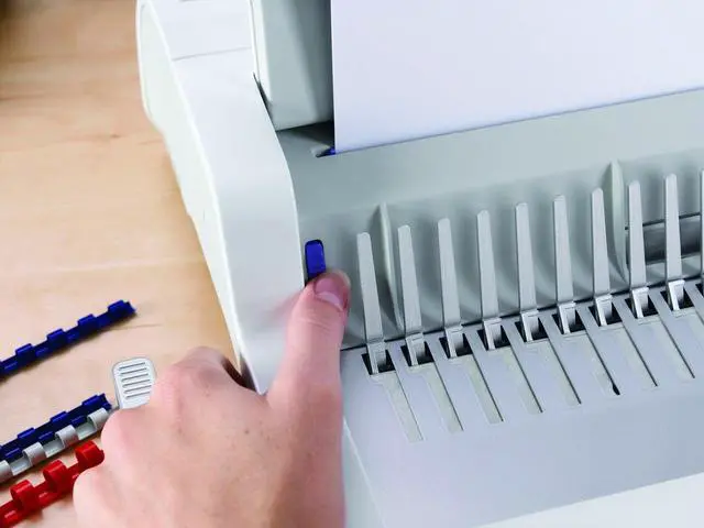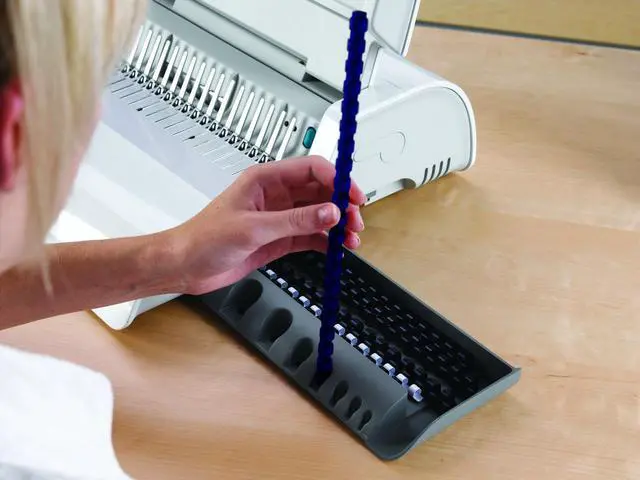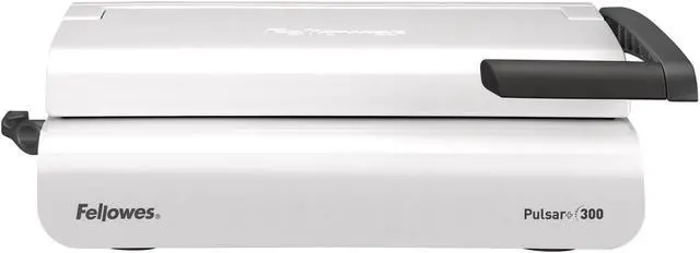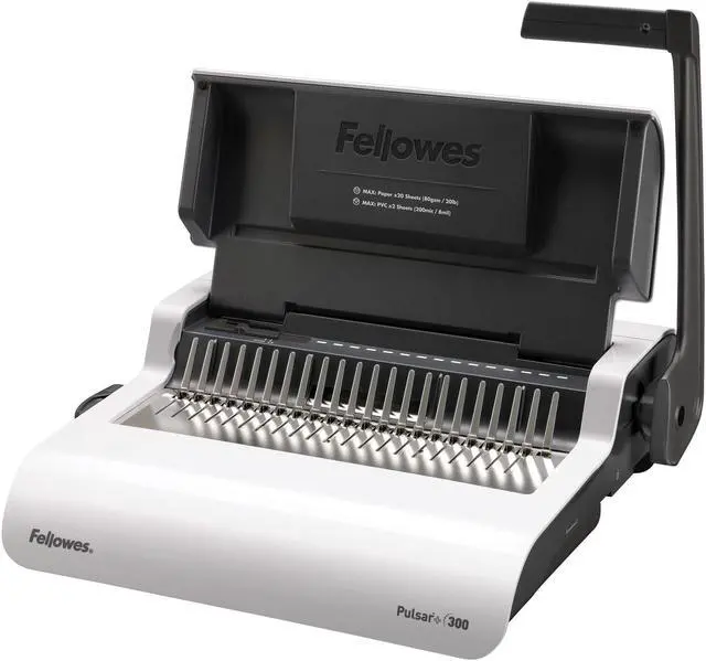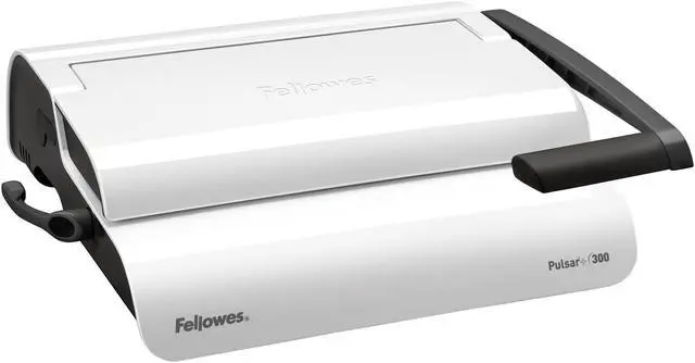 The full-featured, medium duty Fellowes Pulsar Plus Comb Binding Machine is ideal for general office use. Compact machine manually punches up to 18 sheets at a time and binds up to 300 sheets with a 1-1/2-Inch comb. Vertical document loading ensures accurate punch alignment. Efficient design allows user to punch and bind in a continuous manner. Features built-in comb storage tray with document measurement device for added convenience and quick set-up. Adjustable edge guide centers documents with ease. Includes binding starter pack (contents: 10 pk assorted kit).