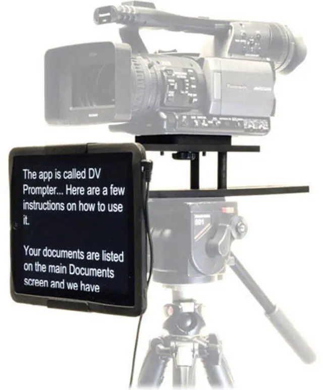 The Datavideo TP300-IP Teleprompter Kit for iPad & iPad2 is a complete kit that works with an iPad and with a downloadable free app. Scripts or cue sheets can easily be pasted into the app and can be scrolled through by an included remote control or at a preset automatic rate. The iPad can be attached front-of-cam or below-lens or used standalone.
