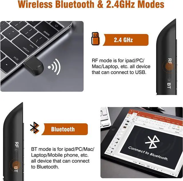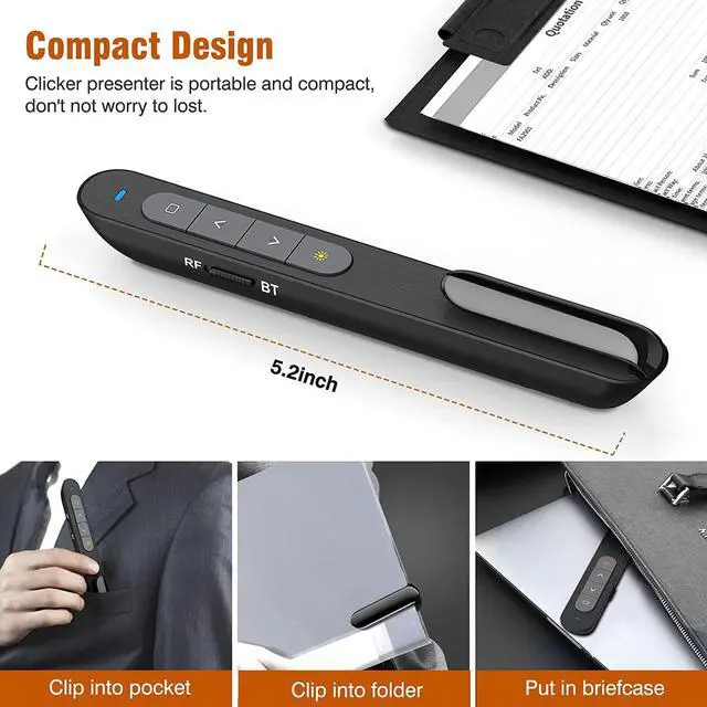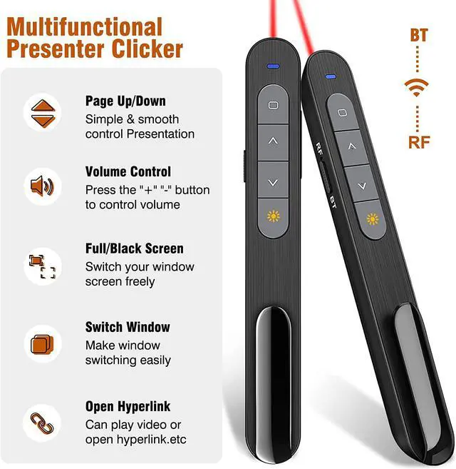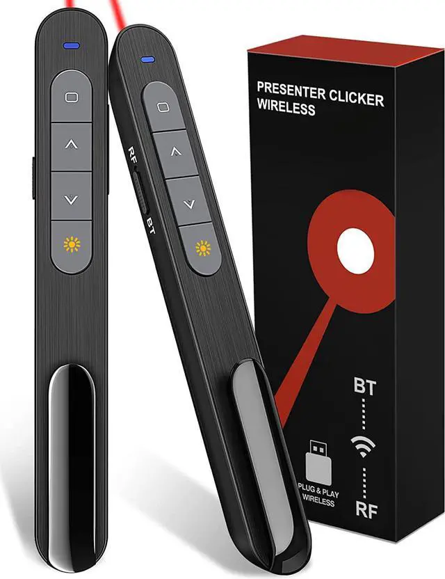 WITH SUPERIOR DETAILSThe laser pointer for presentations has a magnetic slot in the end that holds the USB which prevents it from losing. Bumped-buttons design for operating the presenter without looking down at it. Elegant classic design; comfortable holding feeling; Slender & space-saving. For Bluetooth & 2.4 ghz double modes, BT connection operation for the first-time using. Low power will flash in blue to indicate you to change with the new AAA battery in time.