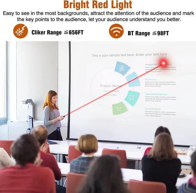 BRIGHT RED LIGHT & LONG CONTROL RANGEThe powerpoint clicker' s red light range: 330ft, the slide advancer with laser pointer with the bright red light that is easy to see against most backgrounds. For bluetooth/ 2.4 g, control