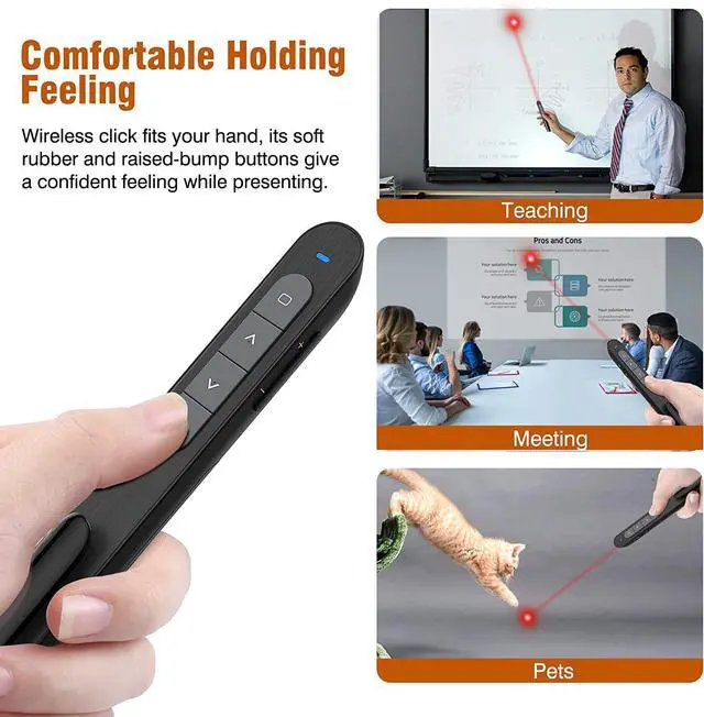PRESENTATION CLICKER & CAT LASER TOYThis presentation clicker supports page up/down, full/black screen, enter hyperlink, volume control, and switch window, it is a good presentation clicker for your presentation/meeting/teaching/speech. The presenter clicker can also be a cat laser toy to play with your cats and dogs with the bright red laser.