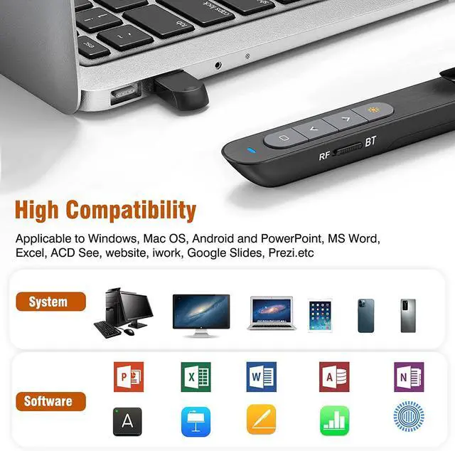 WIDELY APPLICABLEThe presentation remote support systems: Windows 2003/XP/vista/7/8/10, mac os, Linux, android; wireless presentation support software: PowerPoint, google slides, iwork (keynote & numbers & pages), Prezi, pdf, ms word, excel, acd see, website, etc. this presentation clicker with laser pointer is suitable for you to hold a meeting, a teaching or a speeching.