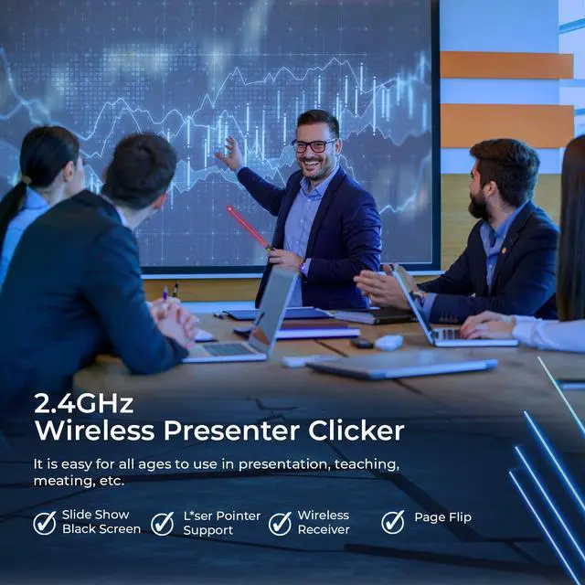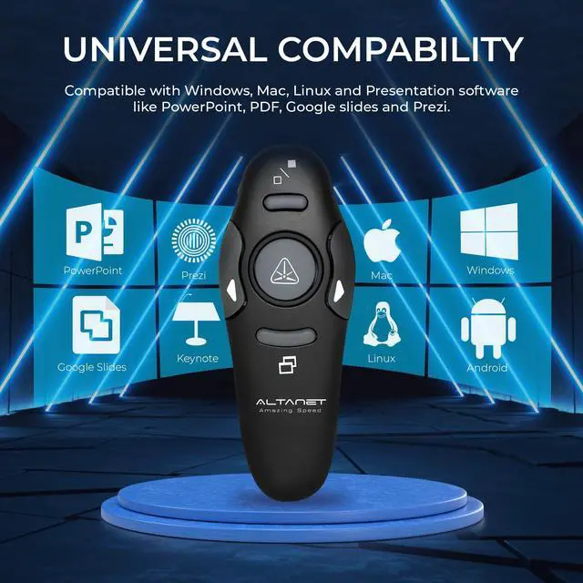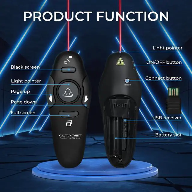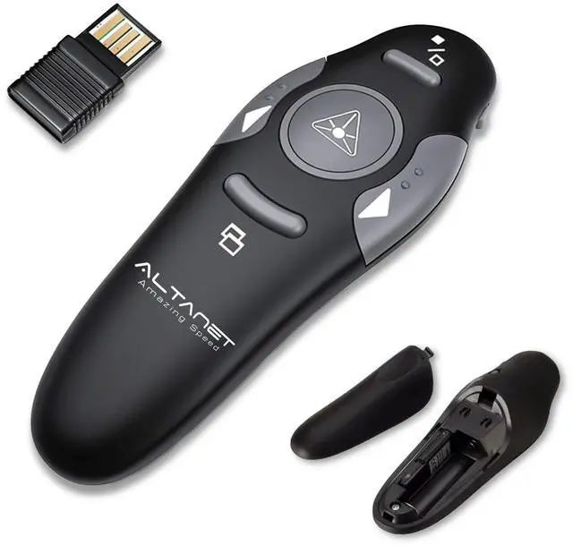 Amazing Ergonomic Wireless presentation clicker for PowerPoint presentations has a cool ergonomic design that makes you more comfortable when you use it to switch PowerPoint, Keynote, or Google Slides. The dark gray buttons and black body convey the designer's philosophy of simplicity. ALTANET PPT clicker can be used in different occasions such as teaching, office, conference, speech, etc. Compact Design The USB dongle is stored in the slot inside the battery compartment of the remote PowerPoint clicker with a bright red light pointer. Easy to carry, remote presentation pointer's size: 109mm, Weight: 38g (Battery NOT included). Wireless presenter remote with a bright red light pointer fits easily in your pocket or bag. How to Use No drivers required. Just plug into the USB dongle, press the connect button on the back of the presentation remote, then start clicking. Supports systems: Windows 2003, XP, Vista, 7, 8, 10, 11, Mac OS, Linux; supports software: Keynote, Google Slides, MS Word, Excel, PowerPoint, Website, PDF. Just Need 1 AAA Battery No special button cell battery. Just one AAA Battery, and you can switch your PowerPoint in the classroom or office. One AAA battery can last about two months (Battery is NOT Included). 100FT Control Distance Slide clicker with a bright red light pointer for presentations control distance: 98FT/30M, bright red light pointer light range: 328FT/100M. You can say goodbye to boring typical teacher pointers for the classroom. We have the coolest computer clicker for presentations control that will rock your presentations and ensure your crowd is always engaged!