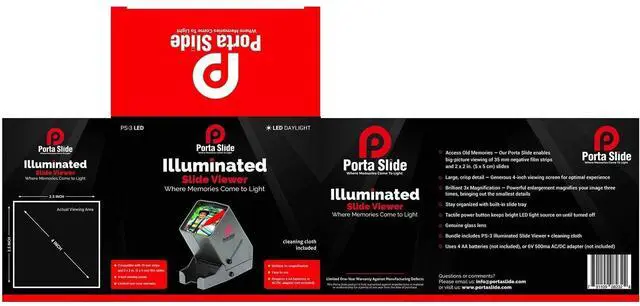 PS-3 Slide Viewer, View 2x2 in. Slides, 35mm Film Strips & Negatives, LED Viewing light, 4 in. Screen, 3x Magnification w/Cleaning Cloth, USB Power Cable included