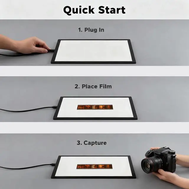 Simply adjust the appropriate light source, place the film on the viewer, and start viewing. Pair it with a smartphone or professional camera to easily photograph your negatives and convert them into high-quality digital images for permanent preservation.