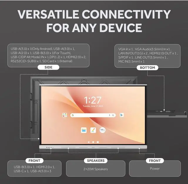 Additional innovations include premium audio speakers and versatile connectivity optionsmaking it the ultimate solution for classrooms, conference rooms, and collaborative workplaces.