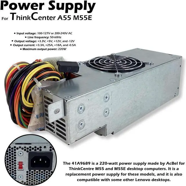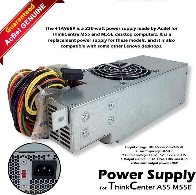 AcBel 220W API5PC58 Power Supply (part numbers 41A9689 and 41A9691) is a genuine replacement component designed specifically for use with Lenovo ThinkCentre A55 and M55E desktop computers, often referred to as the PC6017 series. This power supply unit (PSU) is essential for providing reliable electrical power to the internal components of the computer, ensuring proper functionality and performance.