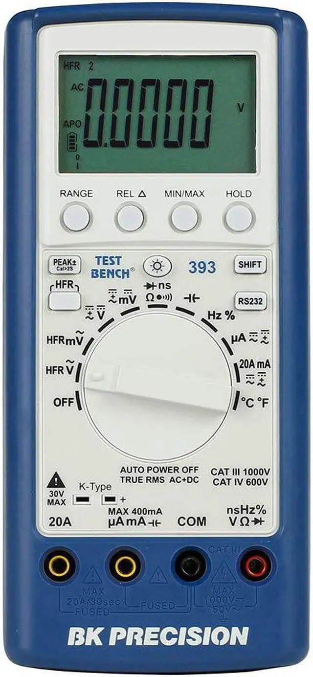 High performance and value priced, the 393 offers more features for the dollar than other multimeters. In addition to measuring voltage and current, the meter also measures capacitance, frequency and temperature, and includes component test, diode test and logic indicator capabilities. A double injection molded case ?provides improved grip and protection.
