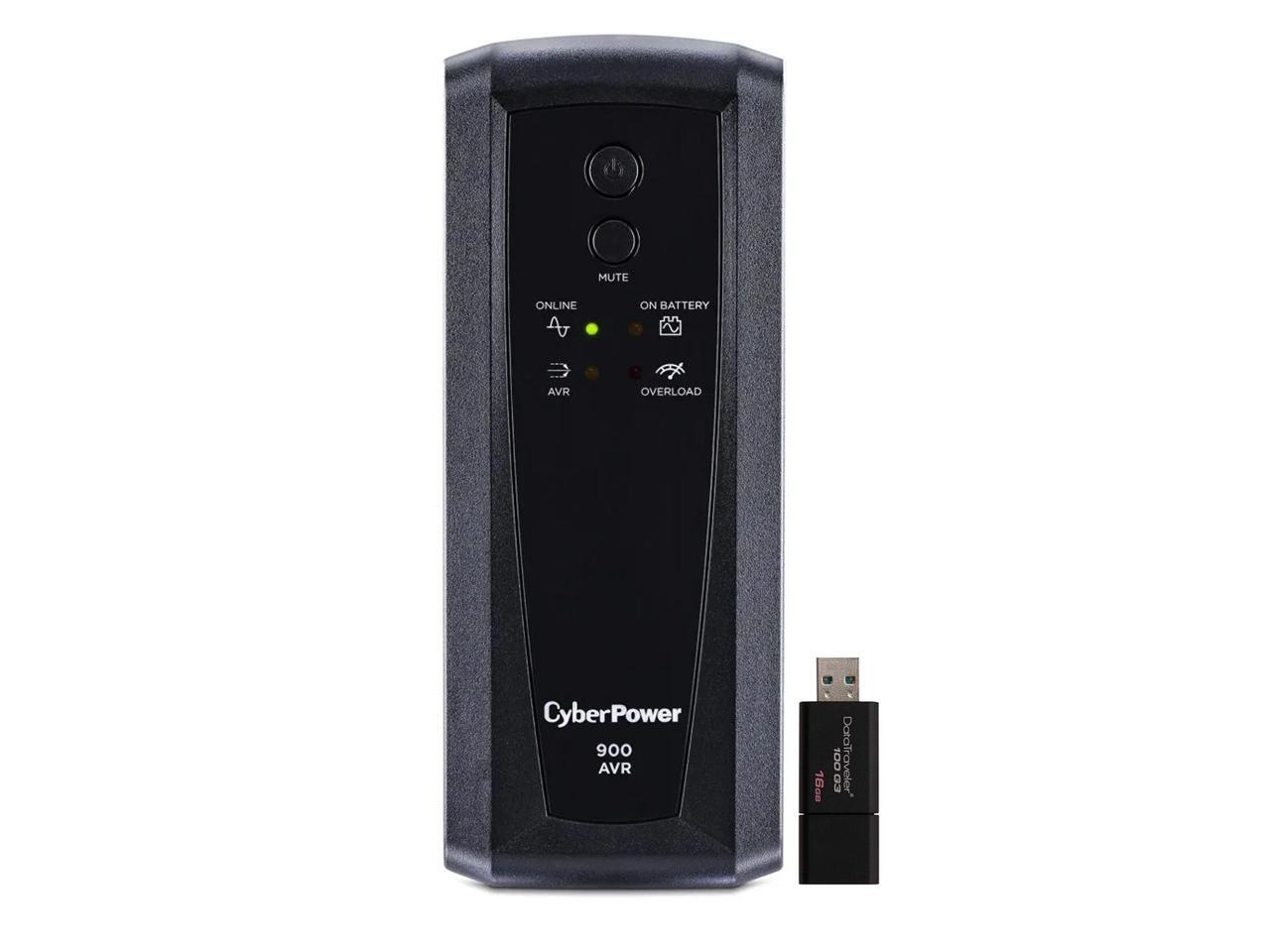 CyberPower CP900AVR Tower UPS System 900VA/560W Backup Battery Power Supply, LED Indicators, 10 x NEMA 5-15R Outlets, AVR, Remote Management, Bundle with 16GB USB Storage