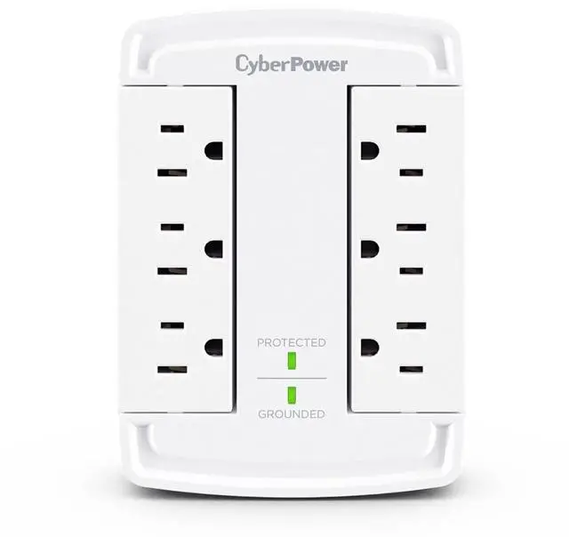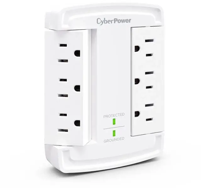 The CyberPower CSB6WS Surge Protector transforms a standard 2-outlet wall socket into six surge-protected outlets, giving you the space and safety your devices need. Perfect for crowded areas where chargers, computers, and electronics compete for limited plugs. Featuring dual swiveling outlet banks, this surge protector offers flexible positioning and improved cord management-keeping your setup neat and organized. With 1800 joules of surge protection, it defends your valuable tech from power spikes and electrical surges. Ideal for safeguarding computers, routers, modems, chargers, and other personal tech essentials.
