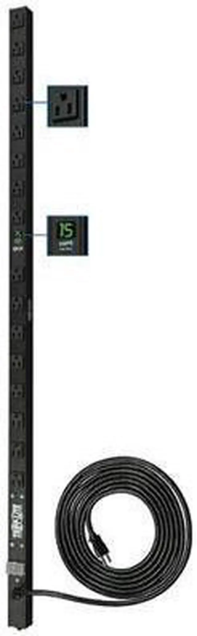 Tripp Lite's PDUMV15 metered power distribution unit offers 15 amp, 120V multi-outlet AC power distribution in a convenient 48-inch mountable housing. Digital current meter displays the power consumption of connected equipment. Offers vertical power distribution in rackmount, raceway, and workbench applications. Includes 16 NEMA 5-15R output receptacles, 15 ft. AC line cord, and lighted power switch with locking transparent cover to prevent accidental shutoff. Sturdy all-metal extruded aluminum housing stands up to demanding network, laboratory, or factory enviroments. Unfiltered electrical pass-through makes the PDUMV15 ideal for distributing alternate waveform UPS or generator power in rack enclosures, network closets and more.