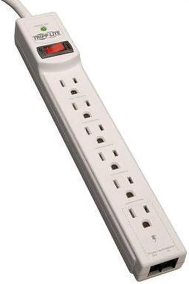 Tripp Lite's TLP608TEL Surge Suppressor offers economical AC and phone line surge suppression for full protection of workstations, desktop PCs, telecom systems and other sensitive electronics. Built-in AC surge suppression shields connected equipment from damage and performance problems due to transient surges. Set of RJ11 telephone line suppression jacks protect dialup and DSL modem lines, fax machines, cordless phones and more. TLP608TEL offers 6 total outlets, 8 foot cord and diagnostic LED to warn of suppressor damage. AC suppression rated at 990 joules shields equipment from surges and line noise. Attractive gray suppressor housing with keyhole mounting tabs and 1 designated transformer plug outlet offers convenient protection of desktop computer equipment and accessories. $20,000 Ultimate Lifetime Insurance (USA & Canada only). Key Features 990 joules AC surge suppression shields equipment from the strongest surges and line noise 6 AC outlets with room for 1 transformer plugs without blocking outlets covers computers and peripherals Phone line surge suppression protects both dialup and DSL modems, plus fax machines, cordless phones and more (pair of RJ11 jacks, 2 wire, 1 line, includes 6 ft phone cable) 8 foot AC line cable Built-in power switch and 15 amp circuit breaker offers power control and overload protection over all outlets Fail-safe thermal fusing protects against fire and other damage in the event of an extreme, extended overvoltage or surge condition Diagnostic LEDs confirm surge suppression status Attractive gray suppressor housing with keyhole mounting tabs allow versatile placement options UL1449 3rd Edition Rated (500V all modes), UL1363 (Power Tap), UL497A (Communications), Meets FCC part 68 rules, cUL (Canada) Exceeds IEEE 587 category A & B surge suppression specifications Lifetime warranty with $20,000 Ultimate Lifetime Insurance (USA & Canada only) Typical Applications Ideal for any desktop, network or home computing application requiring AC and dialup or DSL modem line protection. Package Includes TLP608TEL 6-ft. telephone cord Instruction manual with warranty information