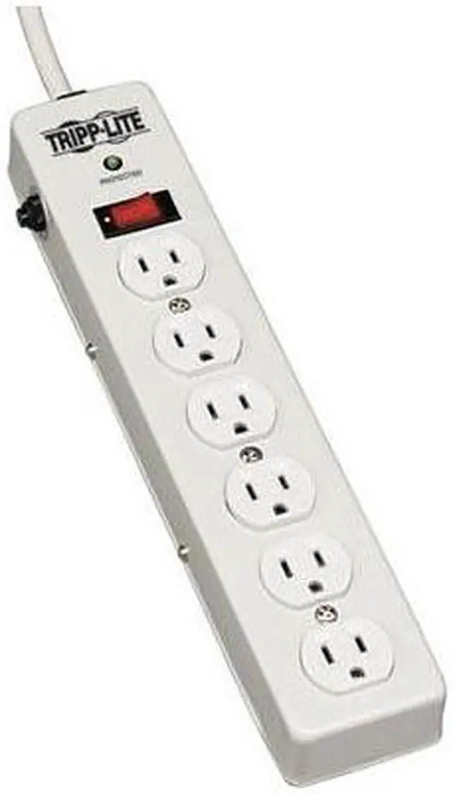 Tripp Lite's TLM606HJ surge suppressor offers complete AC surge suppression for comprehensive protection of personal computers, home stereos, televisions, VCRs, DVD players, power tools and other electrical and electronic equipment. Heavy-duty AC surge suppression shields connected equipment from damage and performance problems due to transient surges. TLM606HJ offers 6 total outlets, a 6 foot power cord and diagnostic LED to warn of suppressor damage. AC surge suppression rated at 1120 joules shields equipment from surges and line noise. Rugged metal housing offers convenient protection of desktop computer equipment and accessories. Lifetime warranty with $75,000 Ultimate Lifetime Insurance (USA & Canada Only). PLUG/OUTLETS: Input - 6 ft. AC line cord with NEMA 5-15P plug/Output - 6 NEMA 5-15R outlets ELECTRICAL: 120V AC, 50/60Hz, 15A (Requires NEMA 5-15R wall receptacle) FORMAT: Metal strip SUPPRESSION: AC: 150V RMS Clamping/1120 joules/330V UL1449 6 outlets 6 ft. cord Surge suppression rating: 1120 joules EMI/RFI noise filtering 15 amp resettable circuit breaker protects against overload Diagnostic LED confirms suppressor "protection present" (green) Convenient keyhole slots allow secure mounting on wall or desk Can accommodate up to 1 transformers without blocking adjacent outlets Rugged metal case provides extra safety and durability Illuminated power switch $75,000 Ultimate Lifetime Insurance (USA & Canada Only) covers connected equipment Lifetime product warranty Applications Ideal for personal computers, TV/VCR/DVD, stereos, power tools and lamps/lighting Package Includes TLM606HJ surge suppressor Instruction manual and warranty information