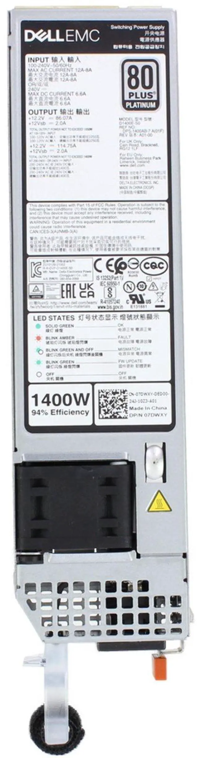 Up for sale is a Dell 15G/16G 1400W 80+ Platinum 60mm PSU (7DWXY-OSTK). All components are tested and firmware is updated. Dell 15G/16G 1400W 80+ Platinum 60mm PSU (7DWXY-OSTK)